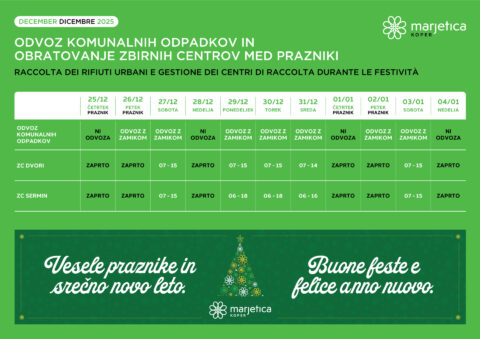 V času praznikov ob koncu leta 2025, bo odvoz odpadkov potekal z dnevnim zamikom. Prilagojeno bo tudi obratovanje obeh zbirnih centrov.